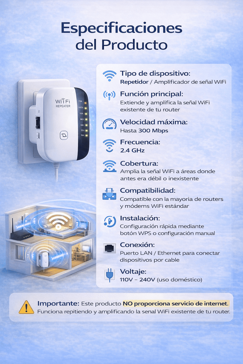 Este dispositivo mejora la cobertura de tu WiFi, pero no reemplaza tu proveedor de internet.