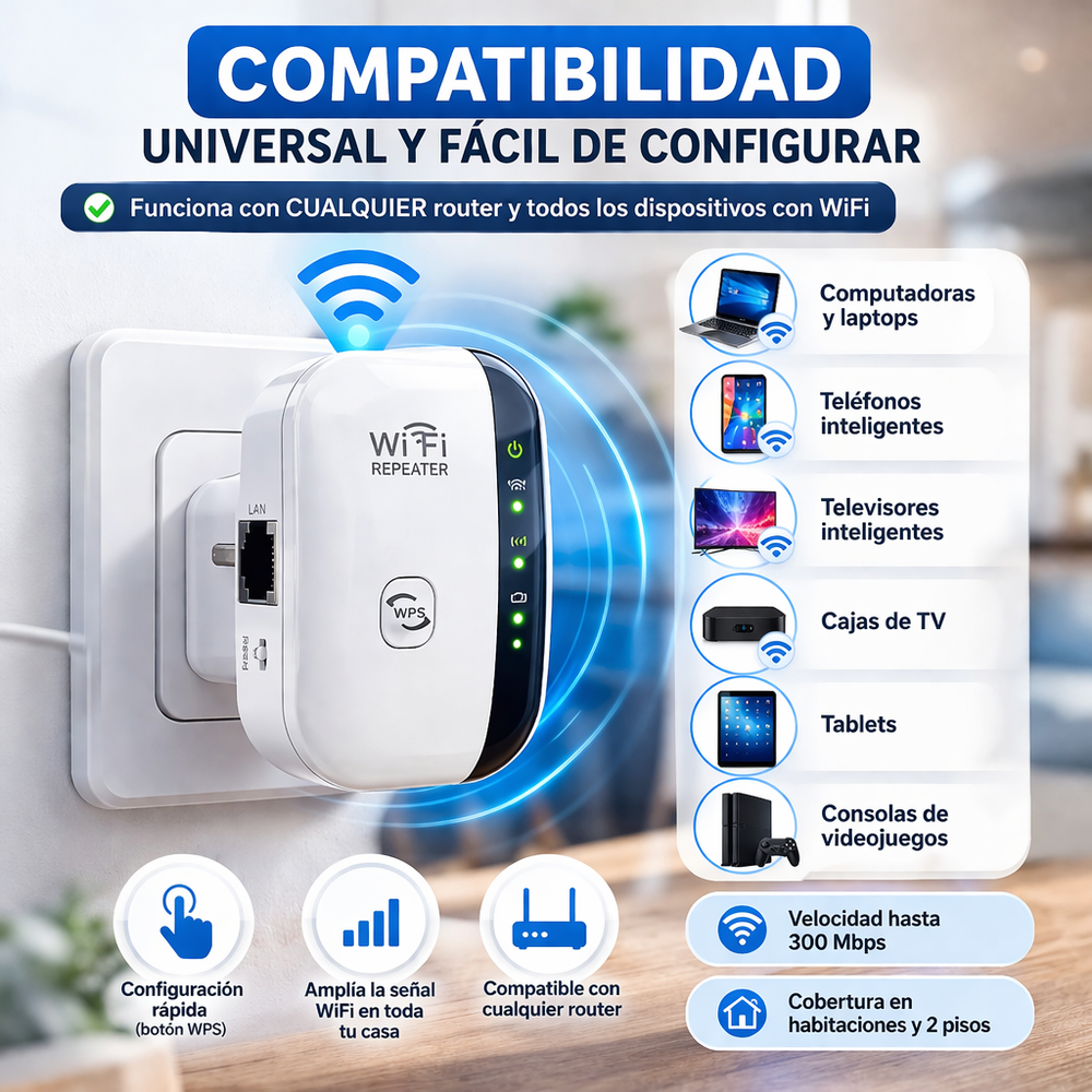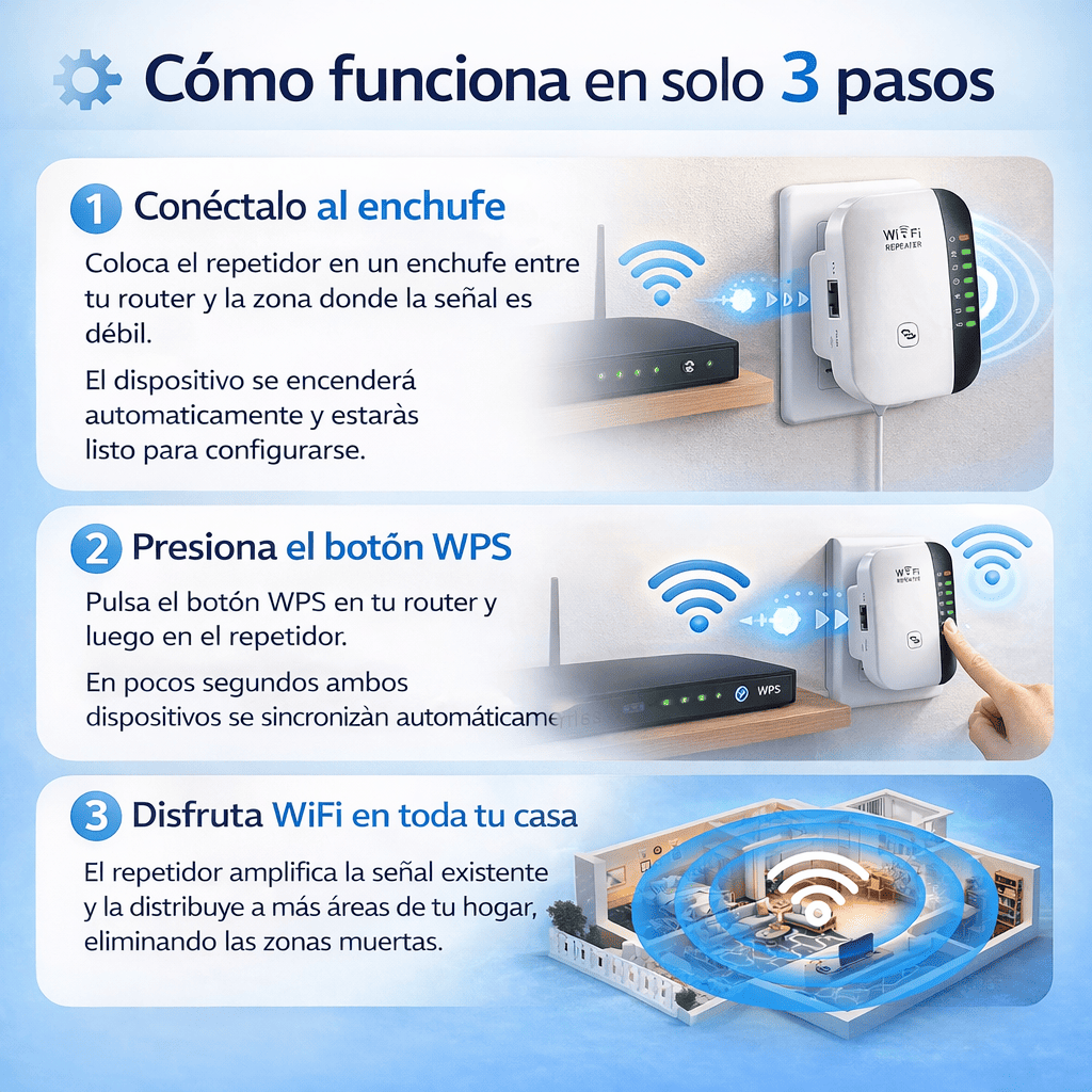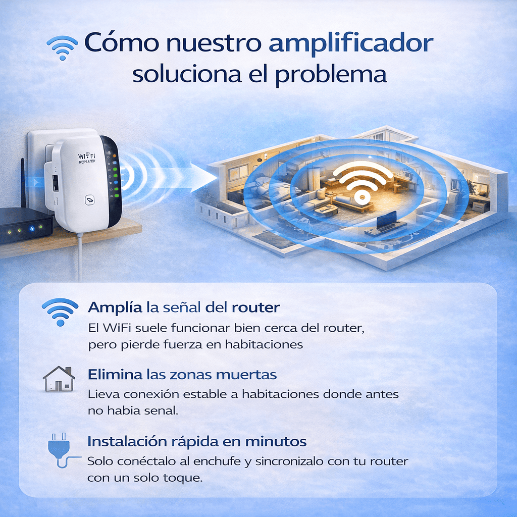 El repetidor amplifica la señal existente y la distribuye a más áreas de tu hogar, eliminando las zonas muertas.