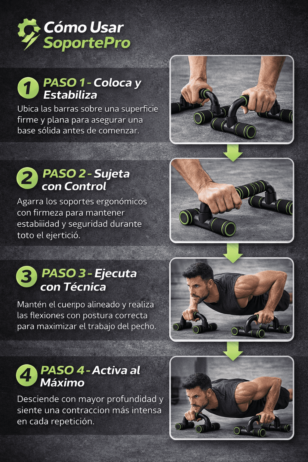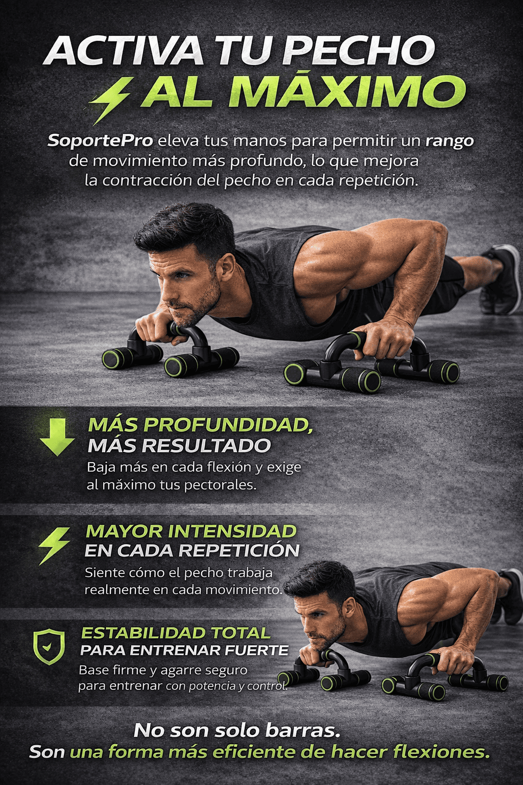 SoportePro eleva tus manos para permitir un rango de movimiento más profundo, lo que mejora la contracción del pecho en cada repetición.